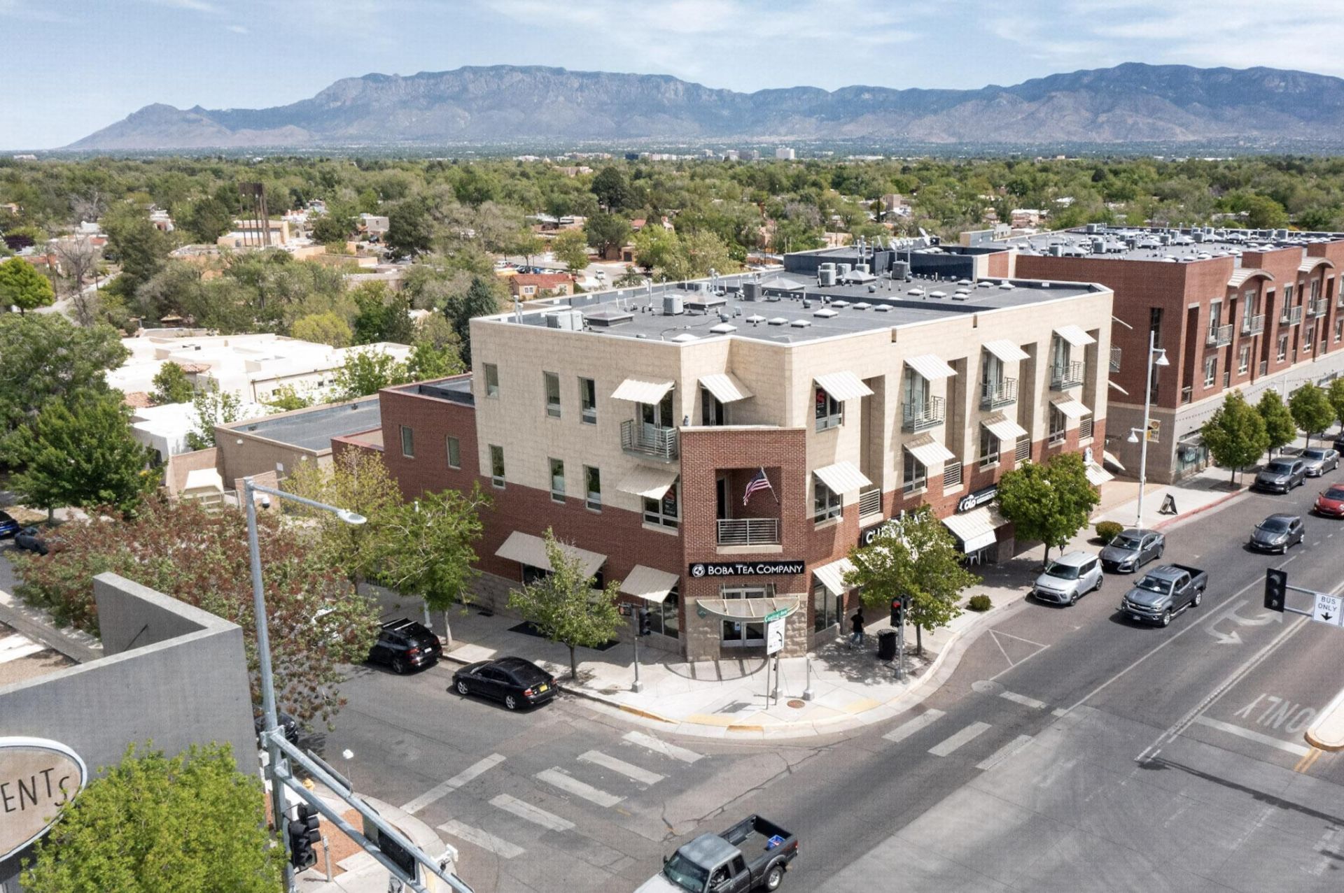 Experience elevated living in the heart of ABQ's vibrant Nob Hill district. Inside, the interior features a bright open layout designed for comfort & flow. Lovely HDWD floors, upscale kitchen & baths, generous BR, & expansive windows frame sweeping, unobstructed mountain & city views. Natural light fills the space, creating warm & inviting rooms. The standout feature is an extraordinary private 700 sq. ft. terrace - deep, fully usable, with gorgeous views! The terrace functions as a true outdoor living space. This exceptional condo blends urban energy with rare private outdoor luxury, offering a lifestyle seldom found in the city. Located steps to fine dining, cafe's, entertainment, UNM, UNMH, this property offers a perfect balance of walkable urban convenience & private retreat.